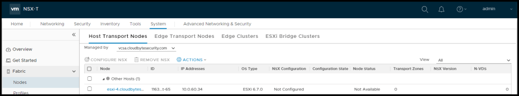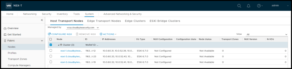 Click on the ‘Managed by‘ drop down just below the top menu and select the compute manager with the hosts you configured NSX-T.