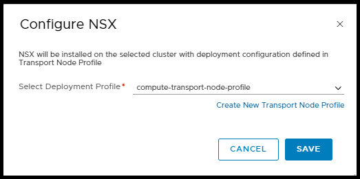 3) Next, we will select the transport node profile we wish to apply to the hosts in the cluster. Once complete, click SAVE.