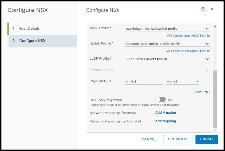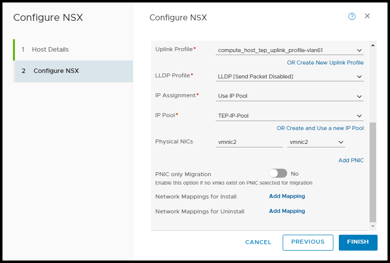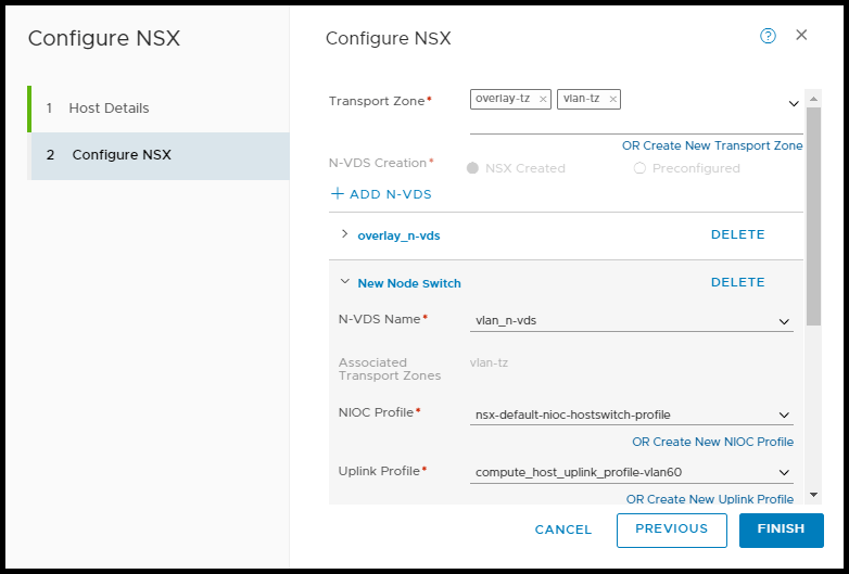 2) Next, a pop-out window will appear to begin configuring the relevant transport node options for the ESXi host. When done, click FINISH.
