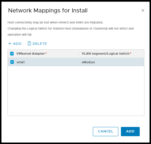 Network Mappings for Install: This feature is available to allow migrating VMkernel adapters to an N-VDS switch during installation to map to an existing VLAN segment or logical switch on an N-VDS.