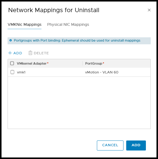 DO NOT DELETE THE ORIGINAL STANDARD OR DISTRIBUTED SWITCH FOR WHICH THE VMKERNEL ADAPTERS ARE ATTACHED. THESE OBJECTS MUST EXIST FOR PROPER UNINSTALLATION TO PREVENT POTENTIAL ISOLATION OF A HOST.