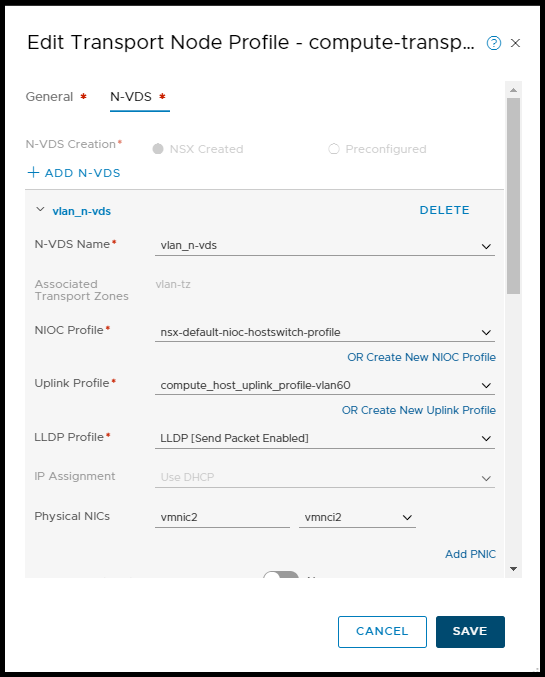 N-VDS Name: Select an N-VDS you would like to associate with this transport node profile. All transport nodes prepared with this transport node profile will use the N-VDS switches defined here. The N-VDS would have been created earlier.