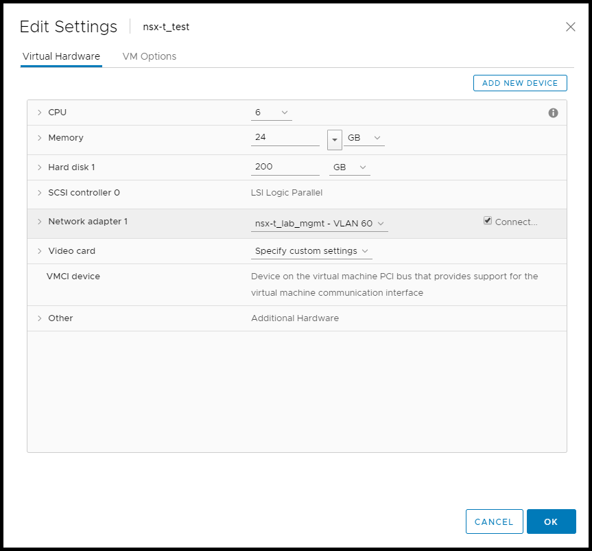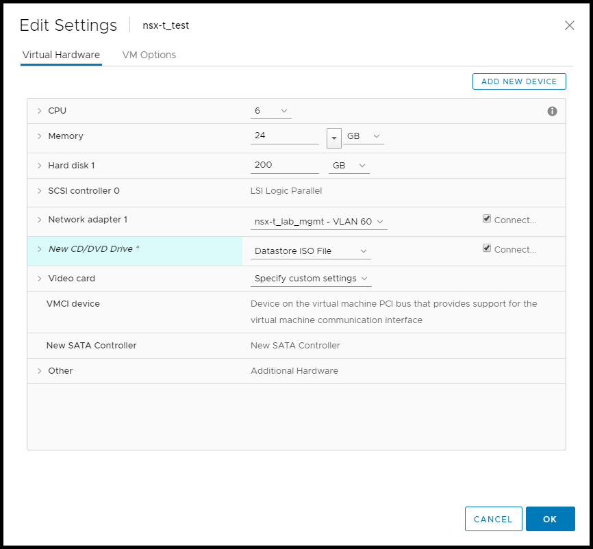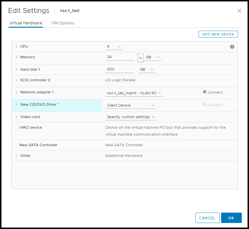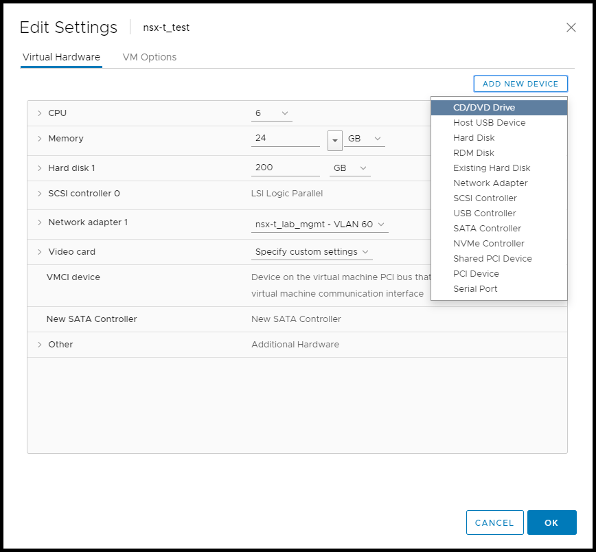 2a. Navigate to Hosts & Clusters > Right click on NSX-T manager > Edit Settings > ADD NEW DEVICES > CD/DVD DRIVE