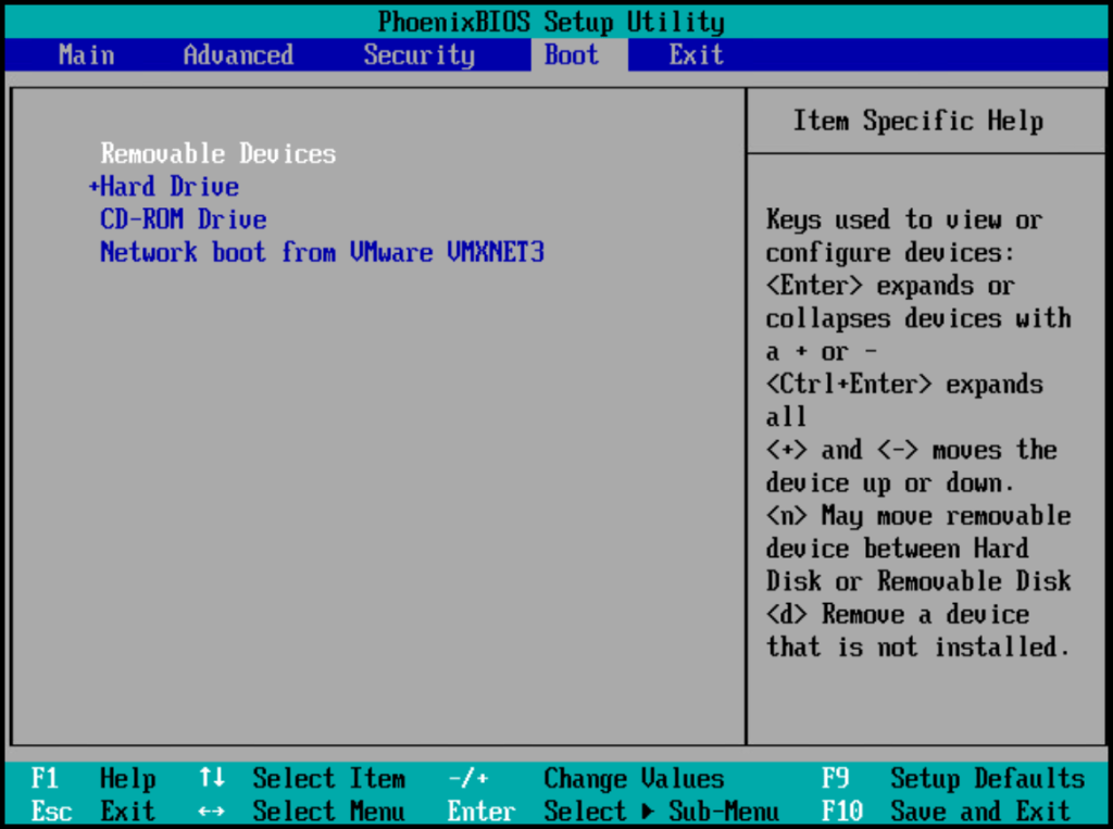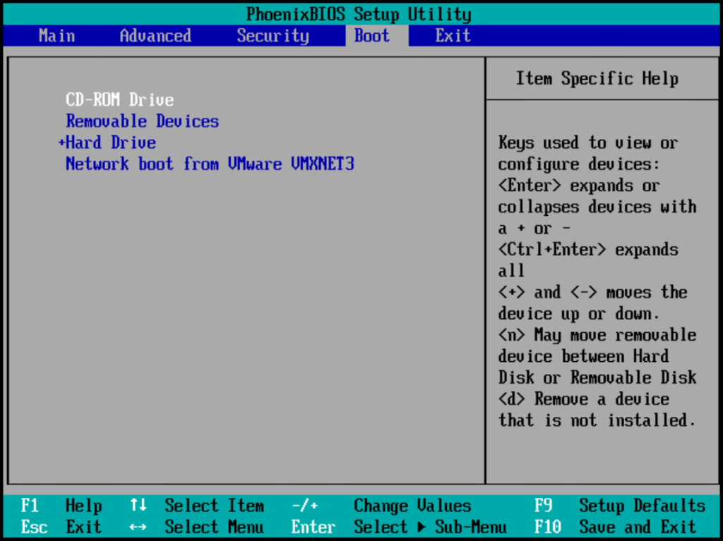 6. When the BIOS screen appears, select the ‘Boot‘ tab on the right and change the boot order by highlighting the ‘CD-ROM Drive‘ and hitting the <+> sign until the CD-ROM Drive is at the top of the list