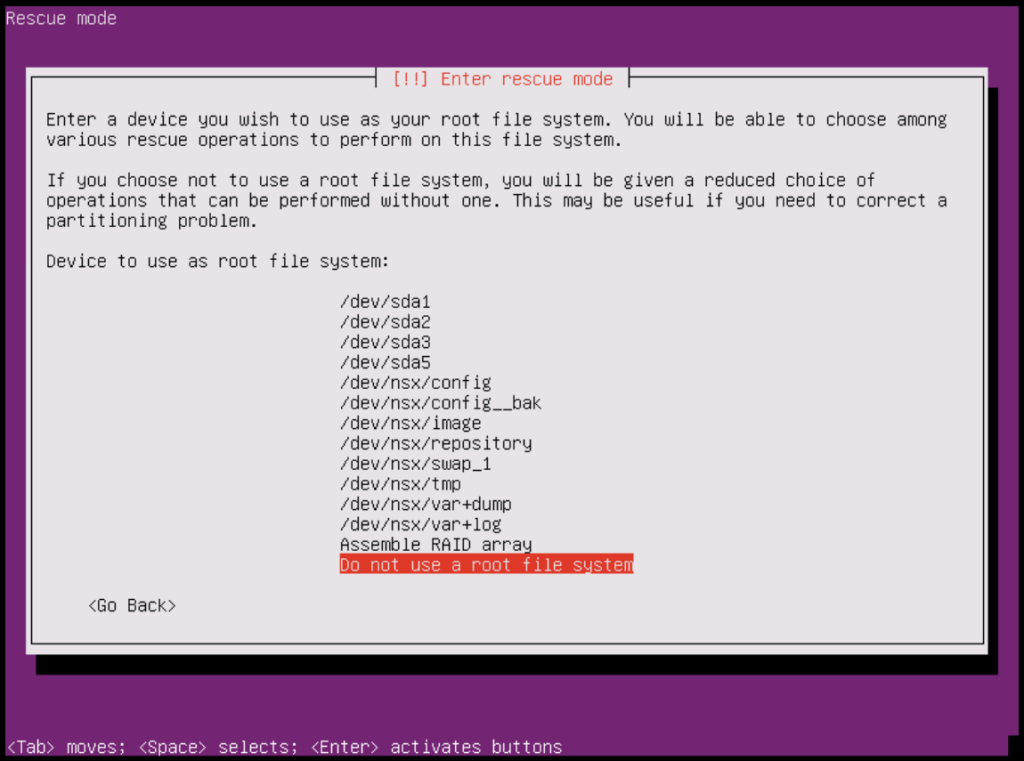 15. Next, you will have an option to choose which partition to use for the ‘root’ filesystem. We do not need to use a root file system. Select ‘Do not use a root file system‘ and hit <ENTER>