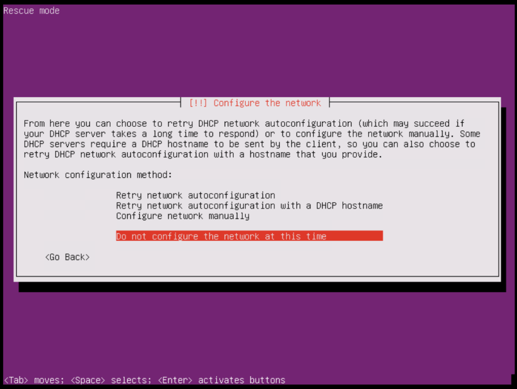 12. Networking options are not needed as we are only going to be modifying the local disk of the NSX-T manager appliance. Select ‘Do not configure the network at this time‘ and hit <ENTER>