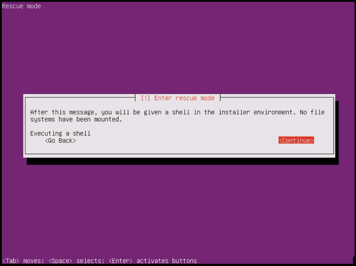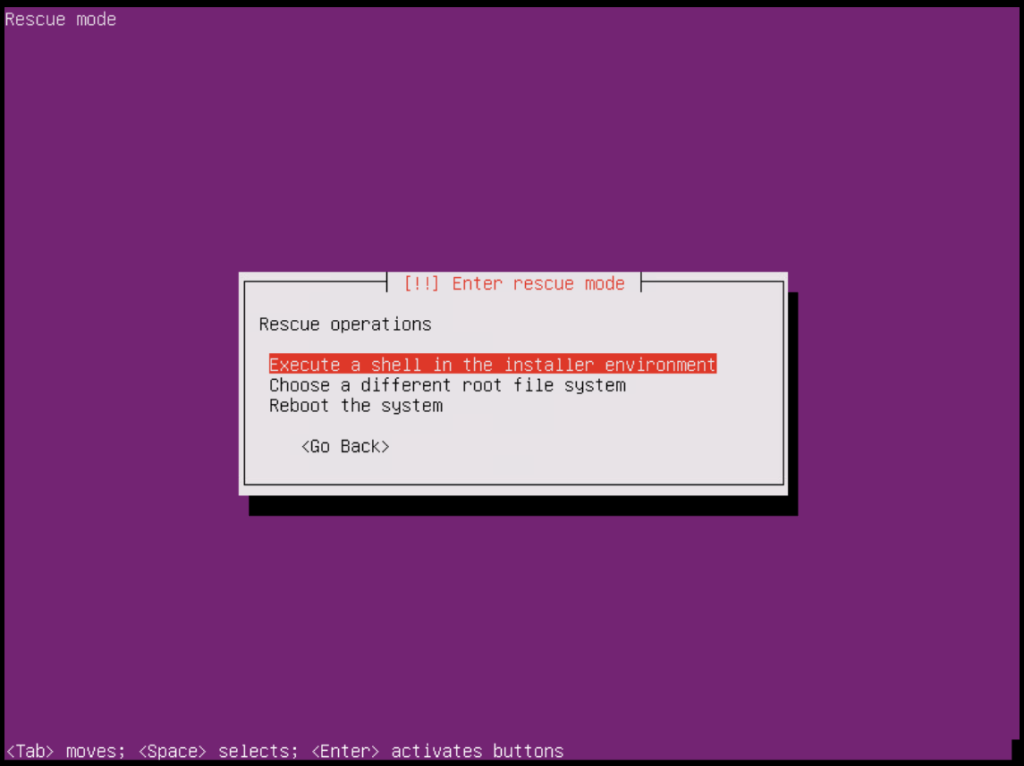 16. Next, to get into the shell needed to make the changes select ‘Execute a shell in the install environment‘ and hit <ENTER>