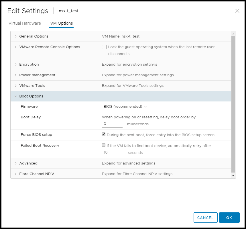 20. Next, click on the ‘VM Options‘ tab at the top of the Edit Settings pop-out, Expand ‘Boot Options‘ > Click the check box to ‘Force BIOS setup‘ and then click, OK