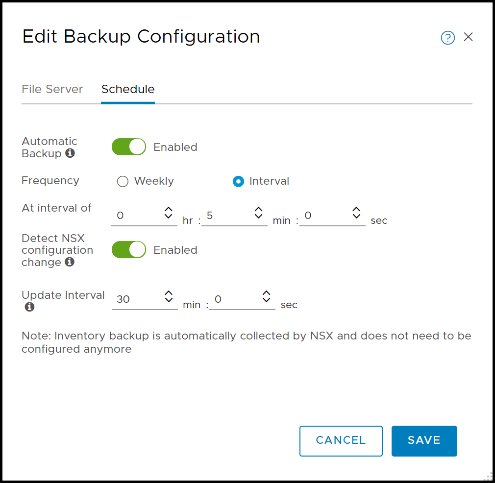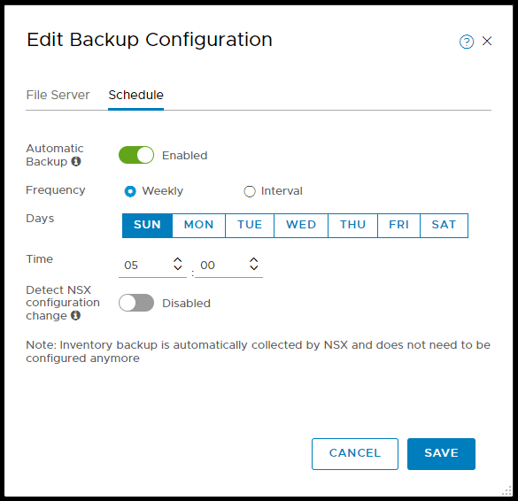 Detect Configuration Change: Toggle on to allow the NSX-T manager to automatically trigger a backup when a change to the configuration is made