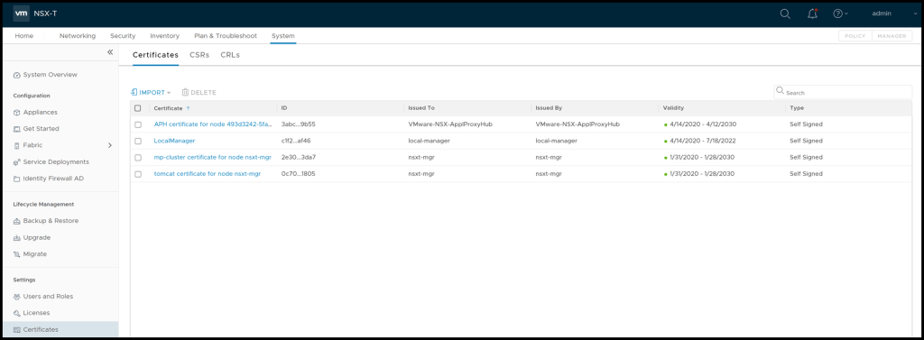 Here is where all the NSX-T platform and service certificates are located within the GUI.