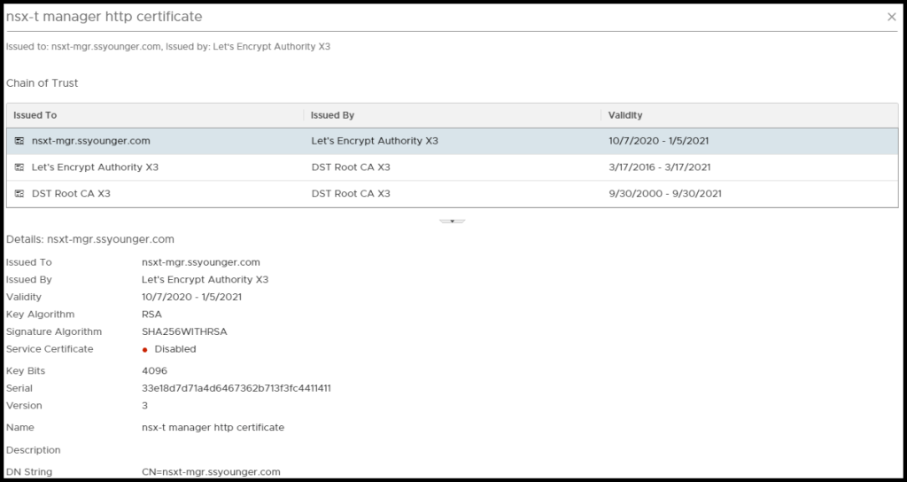 Once you have completed the install of your three NSX-T manager nodes it is a good idea to replace the certificates with certificate authority (CA) signed certificates with your domain. This will provide better security knowing the web page you are connecting to is trusted. Also, you can avoid that annoying “Your connection is not private” page. We will walk through how to replace all the system generated certificates used with the NSX-T manager platform. This includes all three NSX-T manager HTTPS certificates as well as the cluster/VIP certificate.